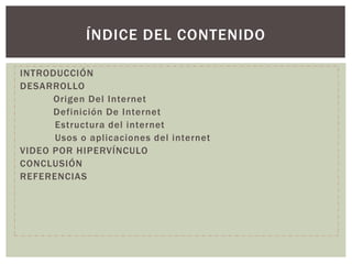 Este documento resume el origen e historia de Internet, su estructura y principales usos. Explica que Internet surgió en 1969 como una red experimental del gobierno de Estados Unidos llamada ARPAnet, y que el protocolo TCP/IP permitió conectar esta red a otras, dando origen a la Internet moderna. Describe la estructura básica de Internet basada en direcciones IP, protocolos y nombres de dominio, así como sus principales usos como medio de comunicación y acceso a información de todo tipo.