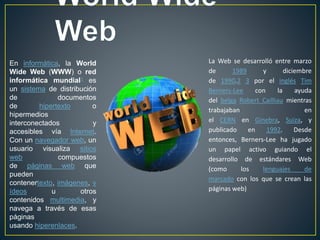 La World Wide Web es un sistema de distribución de documentos hipertextuales interconectados accesibles a través de Internet. Fue desarrollada entre 1989 y 1990 por Tim Berners-Lee en el CERN para compartir información. Los motores de búsqueda indexan los archivos almacenados en servidores web para encontrar información relacionada con palabras clave.