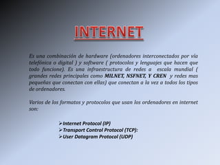Internet es una infraestructura mundial de redes interconectadas que conecta diferentes tipos de ordenadores utilizando protocolos como IP, TCP y UDP. Permite compartir recursos e información a nivel global.