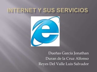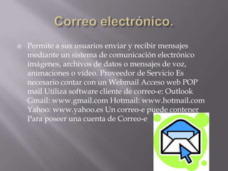 El documento resume los principales servicios de Internet como el correo electrónico, la World Wide Web, las direcciones URL, los navegadores web, los blogs y su uso en comunidades. El correo electrónico permite enviar y recibir mensajes con contenido como texto, imágenes y archivos. La World Wide Web distribuye información hipermedia a través de páginas web compuestas de texto, imágenes y otros medios. Las URL definen la ubicación de la información en la red. Los navegadores web gestionan la descarga de páginas web alo