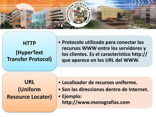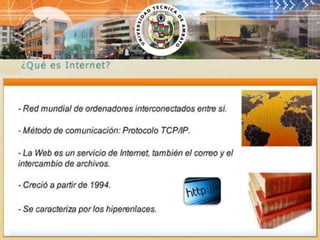 Este documento presenta información sobre Internet y la World Wide Web. Explica que el HTML es el lenguaje utilizado para crear páginas web y que Internet permite buscar información, enviar correo electrónico, comunicarse, compartir archivos y más. Se necesita una computadora, conexión como ADSL, un proveedor de servicios de Internet y un navegador como Google para conectarse a Internet.
