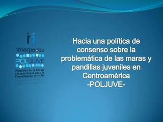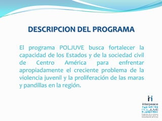 El programa Poljuve tiene como objetivo fortalecer las capacidades de los estados y la sociedad civil en Centroamérica para abordar la violencia juvenil y la proliferación de maras y pandillas. Se basa en un enfoque de transformación de conflictos y prevención, promoviendo la investigación y el diálogo entre diversos actores sociales para formular políticas públicas efectivas. Además, busca generar conocimiento sobre las causas de la violencia juvenil y fomentar colaboración intersectorial en la región.