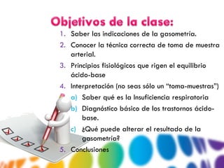 El documento proporciona una guía sobre la gasometría, incluyendo indicaciones, técnicas de toma de muestras, principios de equilibrio ácido-base y su interpretación. Se abordan diferentes tipos de insuficiencia respiratoria, sus causas y parámetros de medición necesarios para un diagnóstico adecuado. Además, se discuten errores comunes en la interpretación de resultados y condiciones que pueden afectar los resultados de la gasometría.