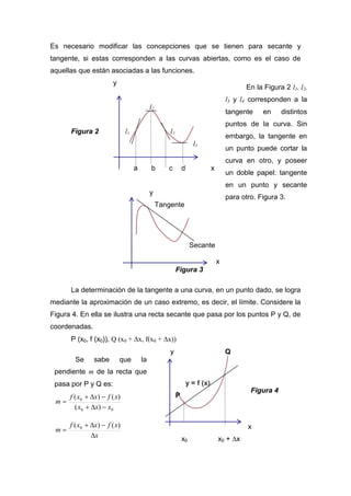 1) El documento explica el concepto geométrico de la derivada como la pendiente de la recta tangente a una curva en un punto. 2) Se define la derivada de una función f(x) como el límite de la pendiente de la secante a medida que el punto Q se acerca a P. 3) La derivada numéricamente es igual a la tasa de cambio promedio de la función en un intervalo e indica cómo varía la función cerca de ese punto.