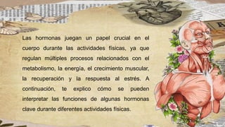Las hormonas como el cortisol, adrenalina, testosterona, hormona de crecimiento, y insulina son cruciales en la regulación del rendimiento físico, energía, recuperación y crecimiento muscular durante diferentes actividades. La interpretación de sus funciones permite optimizar el entrenamiento y garantizar una adecuada respuesta hormonal. Adaptar el ejercicio a estas fluctuaciones hormonales es esencial para mejorar el rendimiento y la salud general.
