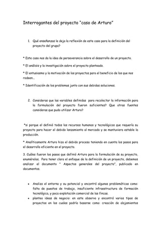Este documento resume los pasos que Arturo definió para formular su proyecto de producción de plátano para exportación. Primero, analizó el entorno y sus problemas como falta de empleo e infraestructura. Luego, planteó varias ideas de negocio para la región. Finalmente, seleccionó el proyecto de plátano para exportación porque lo vio como una oportunidad productiva y estable para la región.