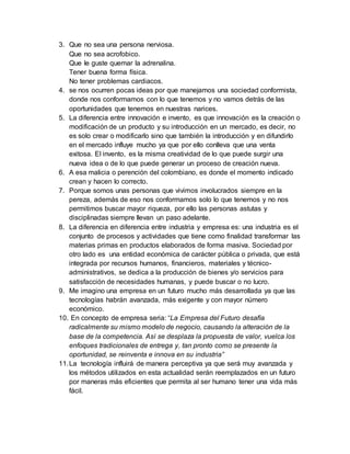 El documento presenta una serie de preguntas sobre ideas nuevas, innovación, empresas del futuro y competitividad. Plantea interrogantes sobre cuántas ideas se le ocurren a alguien en diferentes períodos de tiempo y por qué a algunas personas se les ocurren más ideas que a otras. También cuestiona la diferencia entre innovación e invento, cómo será la tecnología, el conocimiento y las empresas en el futuro, y el papel que jugarán la innovación y la preparación para hacer frente a un mundo globalizado.
