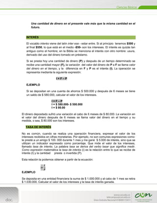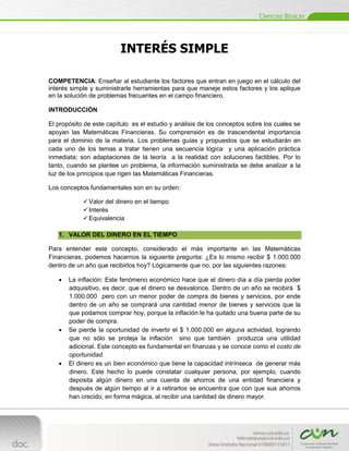 El documento explica los conceptos básicos de interés simple, incluyendo el valor del dinero en el tiempo, interés, tasa de interés, equivalencia y flujo de caja. Define cada término y proporciona ejemplos numéricos para ilustrar los cálculos.