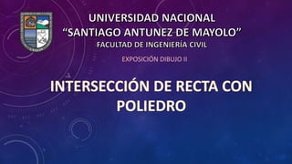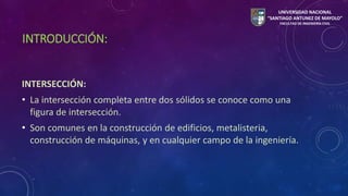 Este documento presenta información sobre poliedros e intersecciones de sólidos. Introduce los poliedros regulares e irregulares, describiendo sus elementos constituyentes como caras, aristas y vértices. Explica cómo localizar puntos en caras de prisma y pirámide usando planos cortantes, y cómo determinar la intersección entre un volumen y una línea trazando la sección plana creada por el plano cortante.