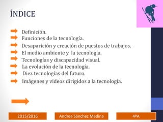 Este documento define la tecnología y discute su impacto en el empleo, el medio ambiente y las personas con discapacidad visual. También describe la evolución acelerada de la tecnología desde la Segunda Guerra Mundial y presenta diez tecnologías emergentes, incluidos asistentes de IA y geoingeniería a gran escala. El documento concluye con un enlace de video relacionado con la tecnología.