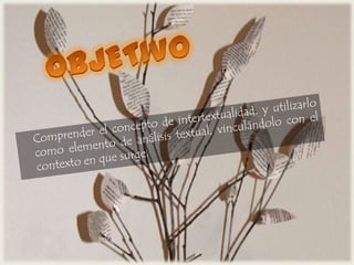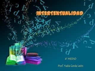 La intertextualidad se refiere a las relaciones entre obras literarias u otros textos culturales. Puede ser de tipo general entre obras de diferentes autores que dialogan creativamente sin copiarse, o restringida entre obras de un mismo autor. Amplía el horizonte de lectura al permitir establecer vínculos entre textos. No debe confundirse con plagio u otras características como parodia o influencia.