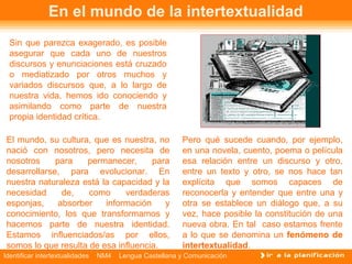 Este documento presenta una introducción al concepto de intertextualidad literaria y ofrece varios ejemplos de cómo se manifiesta en obras literarias. Explica que la intertextualidad se refiere a las relaciones directas entre un texto y uno o más textos previos, y que es común encontrarla a través de epígrafes, referencias e influencias entre obras. También analiza un caso específico de intertextualidad en la novela 2666 de Roberto Bolaño, donde se incorpora la película japonesa Ringu.