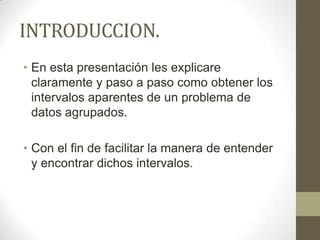Este documento explica cómo obtener los intervalos aparentes y reales de un conjunto de datos agrupados en 6 pasos. Primero, se determinan el valor máximo y mínimo de los datos para calcular el rango e intervalo. Luego, se crea una tabla con los límites inferiores y superiores de los intervalos aparentes. Finalmente, se restan los límites para hallar el tamaño del intervalo real y crear la tabla correspondiente.