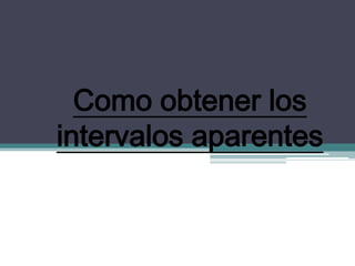 Este documento explica cómo calcular intervalos aparentes de datos agrupados. Primero, se encuentran el valor mínimo y máximo de los datos para determinar el rango. Luego, se elige un número de intervalos y se calcula el tamaño de cada intervalo dividiendo el rango entre el número de intervalos. Finalmente, se establecen los límites inferiores y superiores de cada intervalo sumando el tamaño de intervalo de forma secuencial.