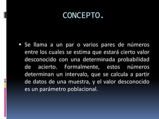 El documento explica los conceptos de intervalos de confianza y niveles de confianza. Define un intervalo de confianza como un rango de valores que probablemente incluirá un parámetro poblacional desconocido, basado en datos de una muestra. Explica cómo calcular intervalos de confianza para la media y la proporción y provee ejemplos numéricos para ilustrar los cálculos.