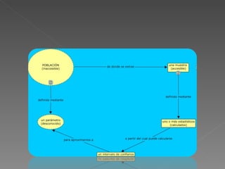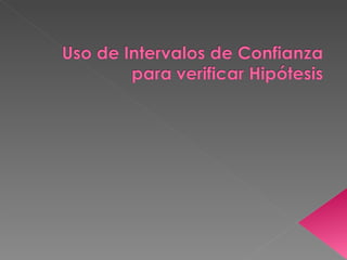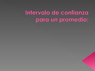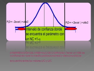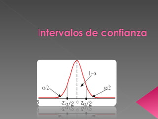 Este documento describe los intervalos de confianza y cómo se construyen. Explica que un intervalo de confianza es un rango de valores que probablemente incluya el verdadero parámetro poblacional, basado en una muestra. Luego detalla cómo construir intervalos de confianza para la media, proporciones y otros parámetros cuando la varianza es conocida o desconocida.