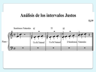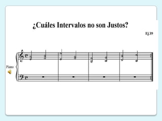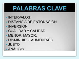 Este documento define los intervalos musicales como la distancia de entonación entre dos notas. Explica que existen intervalos simples de 2 a 8 grados y compuestos formados por la suma de dos o más simples. Además, clasifica los intervalos por su calidad como menor, mayor, disminuido o aumentado dependiendo de si son justos o no. Finalmente, señala que la inversión de un intervalo cambia su dirección pero no necesariamente su calidad.