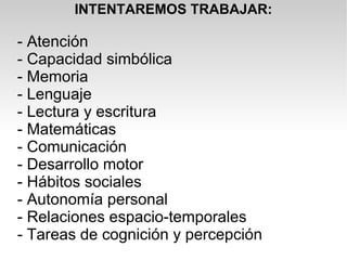 El documento se enfoca en proporcionar estrategias para trabajar diferentes áreas como la atención, capacidad simbólica, memoria, lenguaje, matemáticas y habilidades sociales en niños con necesidades educativas especiales. Propone actividades para desarrollar estas áreas y ofrece consejos sobre cómo captar y mantener la atención de los niños durante las tareas.