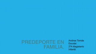 Este documento presenta una propuesta para una actividad deportiva familiar llamada "Predeporte en familia". La actividad incluirá juegos tradicionales y de predeporte relacionados con el voleibol para padres e hijos. Se llevará a cabo en el gimnasio de la escuela de 5 a 7 pm y contará con juegos, explicaciones básicas de técnicas de voleibol y partidos cortos. El objetivo es promover el deporte en familia y mejorar la relación entre padres, profesores y alumnos