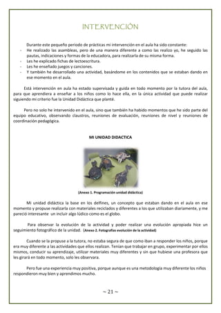 La intervención de la autora en el aula incluyó realizar asambleas, explicar fichas de lectoescritura, enseñar juegos y canciones, y desarrollar una actividad basada en los contenidos del aula. Su única actividad independiente fue una unidad didáctica sobre delfines usando materiales reciclados como globos. La unidad requirió que los niños trabajaran en grupo y dirigieran su propio aprendizaje sin mucha ayuda del profesor, lo que resultó en una experiencia positiva a pesar de ser una met