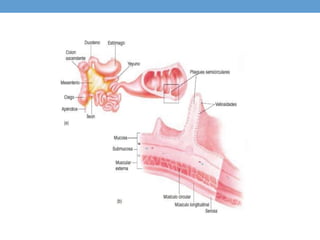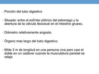 El intestino delgado es la porción del tubo digestivo situada entre el estómago y el intestino grueso. Está compuesto por el duodeno, el yeyuno y el íleon. Su función principal es absorber los nutrientes de los alimentos mediante vellosidades y microvellosidades que aumentan su superficie de absorción. Contiene enzimas digestivas unidas a las microvellosidades que hidrolizan los nutrientes en moléculas más pequeñas que pueden ser absorbidas. Las contracciones peristálticas y de segmentación impulsan el movimiento