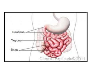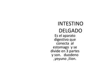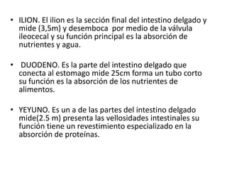 El documento describe las partes del intestino delgado y grueso. El intestino delgado se divide en duodeno, yeyuno e ilion, y su función principal es la absorción de nutrientes y agua. El duodeno conecta al estómago y absorbe nutrientes de los alimentos. El yeyuno absorbe proteínas. El ilion es la sección final e incluye la válvula ileocecal. El intestino grueso incluye el colon asendente, transverso y desciende, y su función es absorber agua y formar las heces.