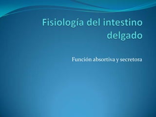 Este documento resume las funciones y enfermedades del intestino delgado. Describe la fisiología de la absorción de nutrientes, la motilidad y las funciones endocrina e inmunitaria. También explica pruebas diagnósticas y varias afecciones como la obstrucción intestinal, malabsorción, enfermedad celíaca, adenocarcinoma, linfoma y tumores carcinoides.