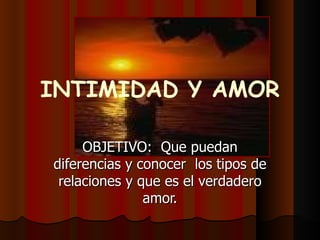 El documento habla sobre la intimidad y el amor. Explica que la intimidad requiere tiempo y privacidad para desarrollar la selección, reciprocidad, mutuo gozo y confiabilidad. También discute los tipos de amor como el romántico, conyugal y ágape. Finalmente, señala que mantener el amor requiere comunicación y preservar la individualidad dentro de la relación.