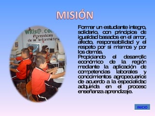 El documento presenta la misión y visión del Instituto Agrícola Risaralda, que busca formar estudiantes íntegros, solidarios y con principios de igualdad para promover el desarrollo económico de la región a través de competencias laborales y conocimientos agropecuarios. También describe la ubicación y historia de la sede Risaralda desde su creación en 1978 hasta la actualidad, atendiendo seis grados desde preescolar a quinto con ampliación de cobertura y servicios. Finalmente, presenta un