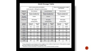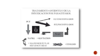 El documento discute el tratamiento de sobredosis de paracetamol, incluyendo dosis tóxicas, síntomas, pruebas de diagnóstico, lavado gástrico con carbón activado, antídoto de acetilcisteína, y consideraciones para embarazadas y niños. El antídoto de acetilcisteína se administra vía oral o intravenosa dependiendo de la gravedad de la intoxicación y los niveles de paracetamol para prevenir daño hepático.