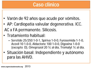 Este documento describe un caso clínico de intoxicación crónica grave por digoxina en un varón de 92 años. Presentaba vómitos, bradicardia arrítmica, deshidratación y niveles séricos de digoxina muy elevados (4.14 ng/ml). Fue tratado con suero fisiológico, atropina y anticuerpos antidigitales, lo que produjo una mejoría clínica y de la frecuencia cardiaca.