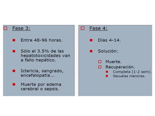 El documento aborda la intoxicación por paracetamol, describiendo su frecuencia en pediatría y las dosis que pueden resultar tóxicas, además de la importancia de medir los niveles plasmáticos para evaluar el riesgo de hepatotoxicidad. También se trata la intoxicación por salicilatos y anticolinérgicos, incluyendo sus mecanismos de acción, síntomas clínicos, y tratamientos recomendados. Se enfatiza la necesidad de intervención médica adecuada y el seguimiento de protocolos clínicos para manejar estas intoxicaciones.