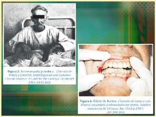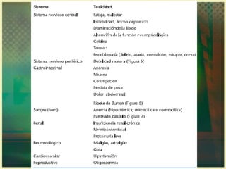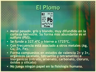 El documento trata sobre la intoxicación por plomo. El plomo es un metal pesado que se encuentra ampliamente en la corteza terrestre y forma parte de compuestos orgánicos e inorgánicos. La exposición al plomo puede ocurrir en ambientes industriales, domésticos o a través de la alimentación. La intoxicación aguda se presenta luego de una alta exposición respiratoria y puede ser mortal, mientras que la crónica o saturnismo es la forma más común y afecta principalmente el sistema nervioso y otros