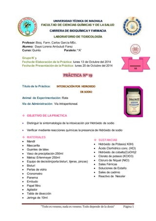 1) La práctica estudió los efectos del hidróxido de sodio en ratas cuando se administra por vía intraperitoneal. 2) Se observó que las ratas experimentaban vómitos, dolores agudos e hipoxia, muriendo en 6 minutos. 3) Las reacciones químicas confirmaron la presencia de hidróxido de sodio en los órganos dañados de las ratas.