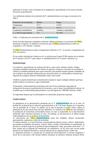 El Vibrio parahaemolyticus es una bacteria que causa intoxicación alimentaria por el consumo de mariscos crudos o mal cocidos. Los síntomas incluyen diarrea, cólicos abdominales, náuseas y vómitos. En casos graves puede causar septicemia. Se diagnostica mediante el cultivo de la bacteria en las heces. El tratamiento principal es la hidratación, aunque en casos severos se pueden usar antibióticos como ciprofloxacino o doxiciclina.