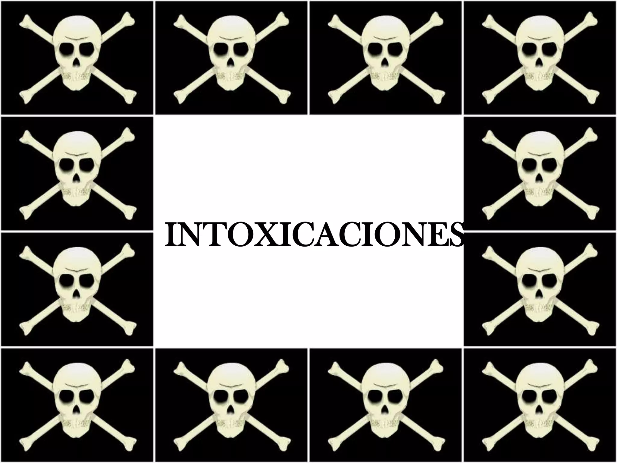 El documento proporciona información sobre intoxicaciones. Define una intoxicación como la exposición de un organismo vivo a un químico que afecta adversamente su funcionamiento. Detalla las causas comunes de intoxicaciones, los grupos de agentes tóxicos más frecuentes como insecticidas, medicamentos y drogas, y los síntomas y tratamientos más comunes de intoxicaciones por insecticidas y medicamentos.