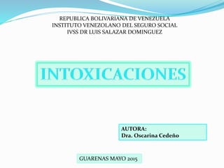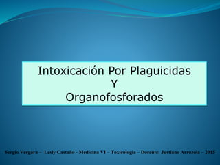 El documento resume los temas de intoxicación por plaguicidas organofosforados e intoxicación etílica aguda. Describe la absorción, metabolismo y toxicidad de los plaguicidas organofosforados, así como su tratamiento con atropina, pralidoxima y benzodiacepinas. Explica también los síntomas y tratamiento inicial de la intoxicación etílica aguda, incluyendo la intubación y lavado gástrico en algunos casos.