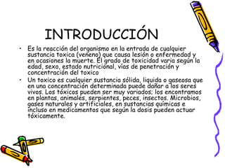 Este documento trata sobre las intoxicaciones. Explica que una intoxicación ocurre cuando una sustancia tóxica entra en el cuerpo y causa daño o enfermedad. Describe varios modos en que las personas pueden intoxicarse, como por ingestión de medicamentos, plantas venenosas o gases tóxicos. También clasifica diferentes tipos de sustancias tóxicas y explica señales comunes de intoxicación como vómitos, mareos y dificultad para respirar. Por último, da recomendaciones para prevenir la absorción de sustancias tó
