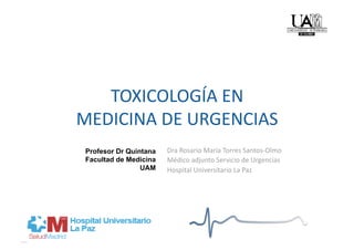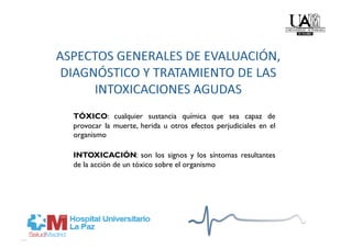 Este documento trata sobre la toxicología en medicina de urgencias. Explica que una intoxicación son los signos y síntomas resultantes de la acción de un tóxico en el organismo. Detalla los pasos para el diagnóstico de una intoxicación incluyendo la anamnesis, exploración física, pruebas de laboratorio y análisis toxicológico. También describe las diferentes manifestaciones clínicas que pueden presentarse y la estrategia general de tratamiento enfocada en estabilizar al paciente, prevenir más absorción del tóxico y ac