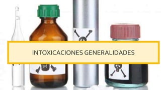 Este documento proporciona información general sobre las intoxicaciones. Define intoxicación como la entrada de una sustancia tóxica en el cuerpo que causa un efecto dañino. Explica que las intoxicaciones son un problema importante de salud pública y menciona algunos agentes causales comunes como medicamentos y productos químicos. También describe los síntomas clínicos, el diagnóstico, el tratamiento general que incluye descontaminación y apoyo de órganos, y medidas para aumentar la eliminación de toxinas del cuerpo.