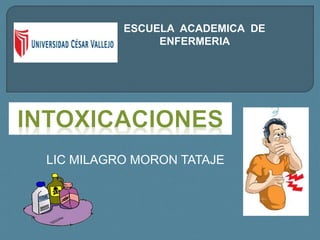 El documento habla sobre las intoxicaciones, sus causas, tipos, síntomas y tratamiento prehospitalario. Menciona que las intoxicaciones son un problema frecuente y pueden ser causadas por factores humanos o biológicos como dosis excesivas de medicamentos, uso inadecuado de productos químicos, manipulación de plantas venenosas o consumo de alimentos en mal estado. Explica los principios para el manejo como identificar el tóxico, apoyar los sistemas afectados, bloquear la absorción y aumentar la excreción del tó