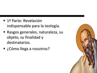 El documento describe las fuentes y método de la teología según el Concilio Vaticano II. La Revelación de Dios es la única fuente, la cual se transmite a través de las Sagradas Escrituras y la Tradición Apostólica. Estas no son divisiones sino modos complementarios de transmitir el único Evangelio. El Magisterio de la Iglesia, formado por los obispos con el Papa, tiene la función de conservar e interpretar fielmente la Revelación a través de los siglos.