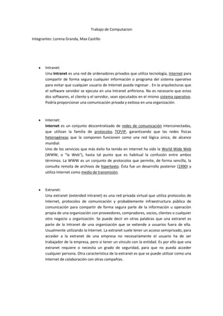 El documento compara y contrasta Intranet, Internet y Extranet. Una Intranet es una red privada dentro de una organización que comparte información de forma segura. Internet es una red descentralizada global que conecta redes heterogéneas usando protocolos TCP/IP. Una Extranet es una red privada virtual que permite compartir parte de la información u operaciones de una organización de forma segura con socios externos usando protocolos de Internet e infraestructura pública.