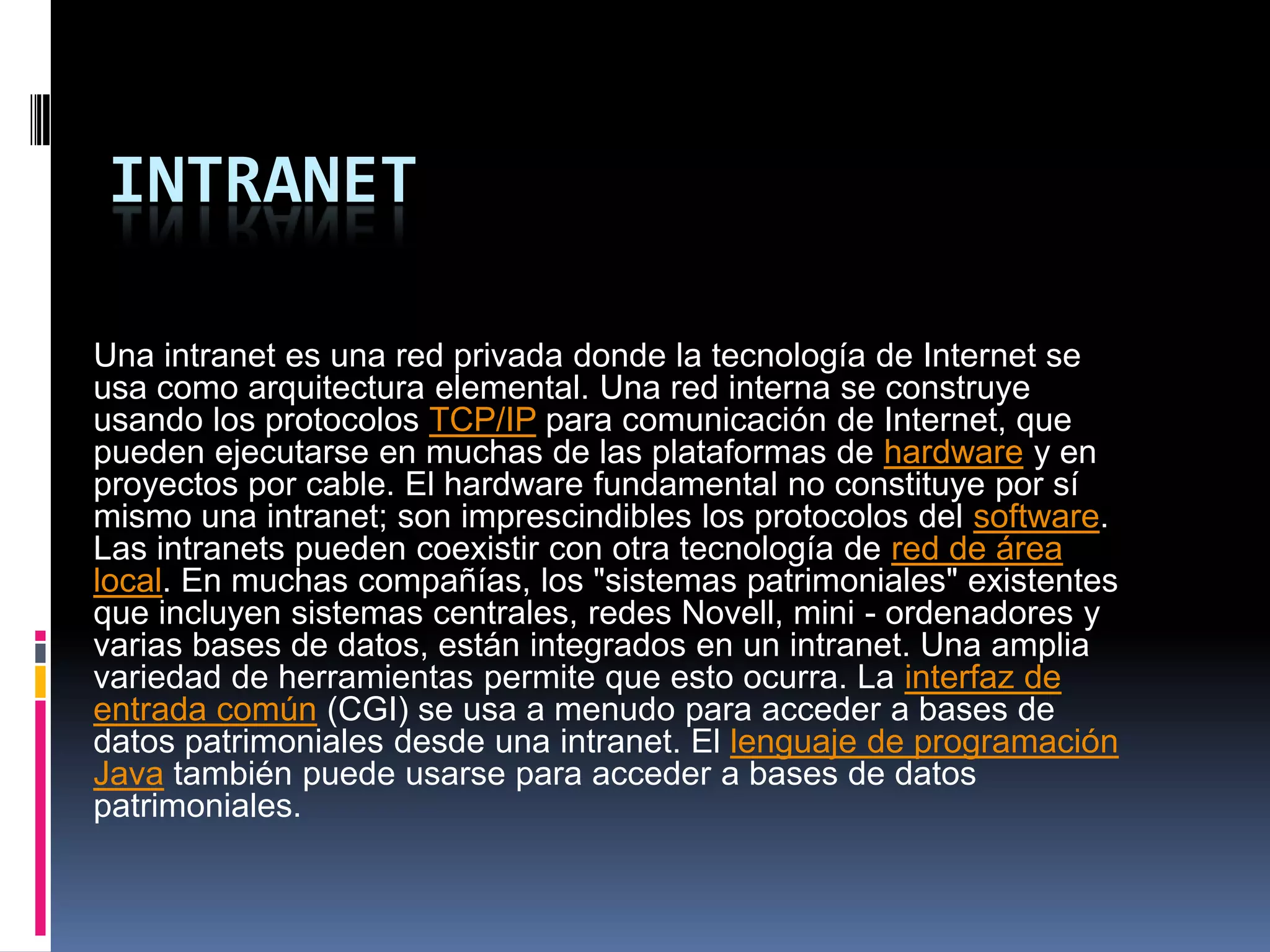 Una intranet es una red privada interna dentro de una organización que utiliza la tecnología y protocolos de Internet como TCP/IP para permitir la comunicación entre sistemas de hardware y software patrimoniales existentes como sistemas centrales, redes Novell, bases de datos y miniordenadores. La seguridad en una intranet es más compleja que en Internet ya que debe proteger tanto a usuarios internos como externos y ofrecer servicios como HTTP, FTP y correo electrónico solo a usuarios internos de la red privada.