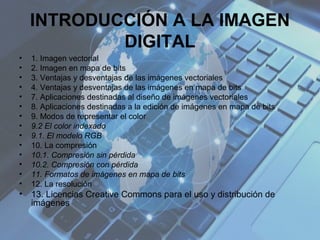 Este documento introduce los conceptos básicos de imágenes digitales, incluyendo las diferencias entre imágenes vectoriales y de mapa de bits, sus ventajas y desventajas, modos de representar color, compresión, formatos, resolución y licencias Creative Commons. Explica que las imágenes vectoriales usan objetos geométricos matemáticos mientras que las de mapa de bits usan píxeles, y cubre aplicaciones de software para cada tipo de imagen.