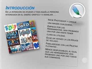 Este documento ofrece una introducción a las herramientas y funciones básicas de Photoshop, recomendando familiarizarse con las herramientas, paletas, menús y atajos de teclado. Explica que la barra de menús permite acceder a funciones, la barra de herramientas contiene las herramientas y la barra de opciones describe cada herramienta. También incluye un enlace a 375 pinceles gratuitos para Photoshop.