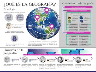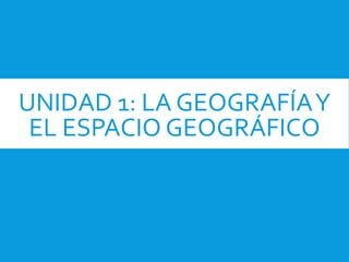 El documento describe el objeto de estudio de la geografía, que es el espacio geográfico. El espacio geográfico está constituido por elementos naturales estudiados por la geografía física y por la intervención humana estudiada por la geografía humana. Además, explica que la geografía estudia estos fenómenos de forma interrelacionada en el espacio a diferentes escalas.
