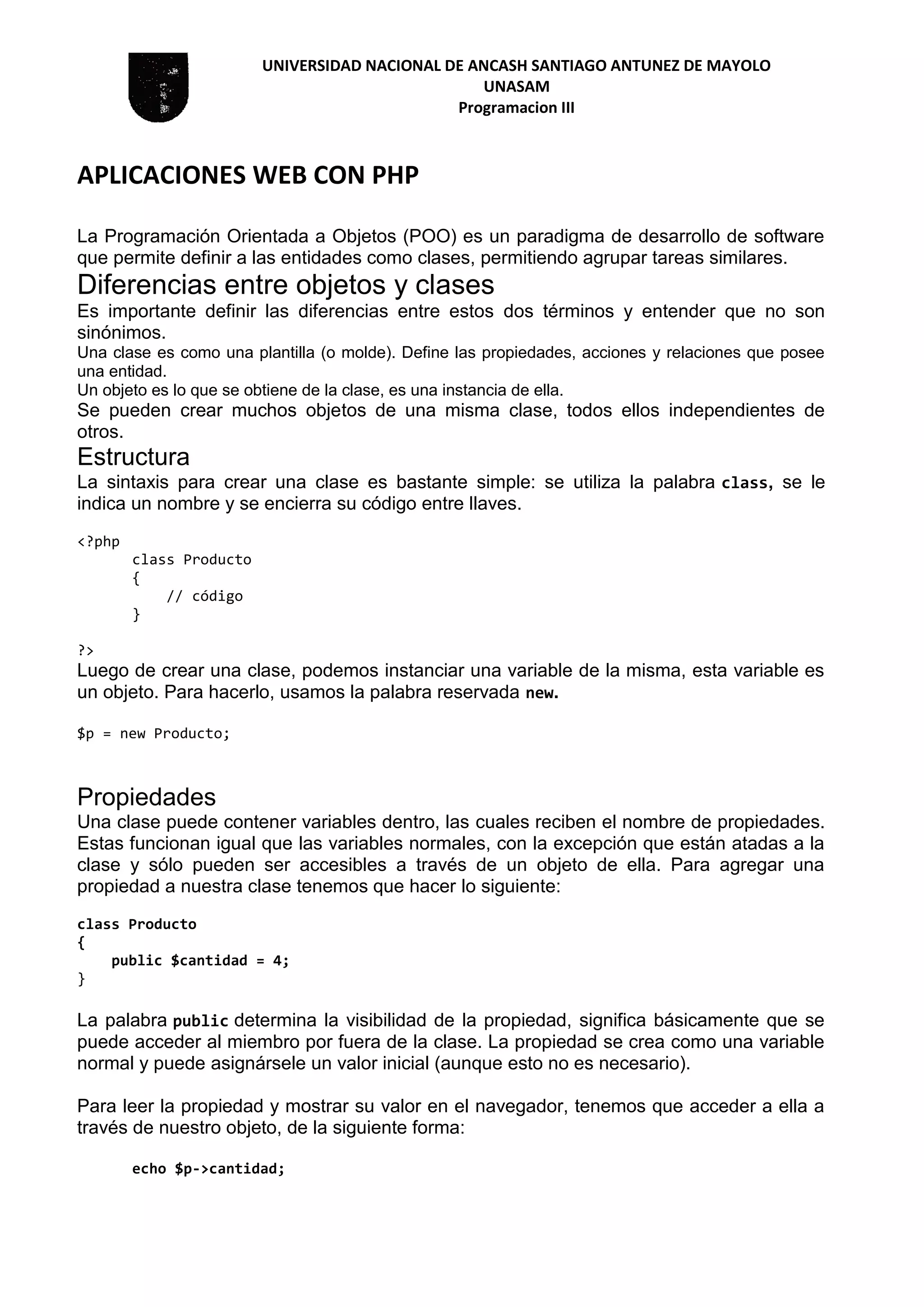 El documento describe los conceptos básicos de programación orientada a objetos en PHP, incluyendo la definición de clases, objetos, propiedades, métodos, constructores y destructores. También explica cómo conectarse a una base de datos MySQL y realizar operaciones básicas utilizando PDO.