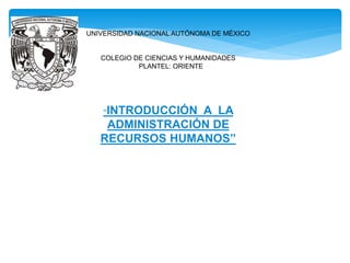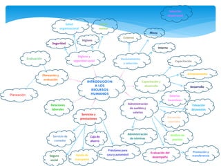 El documento presenta una introducción a los recursos humanos, describiendo diferentes temas como el reclutamiento y selección de personal, el entrenamiento, la capacitación y el desarrollo, la administración de sueldos y salarios, los análisis de puestos, las prestaciones para los empleados, y la planeación y evaluación de recursos humanos. Explica procesos como la selección de candidatos, la capacitación para mejorar la productividad, y el cálculo de sueldos para compensar equitativamente a los empleados.