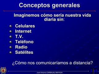 Este documento describe la historia y los conceptos básicos de los sistemas de radiocomunicación. Comienza con una introducción a los sistemas de comunicación sin los cuales la vida moderna sería muy diferente. Luego explica brevemente los primeros métodos de comunicación a distancia como mensajeros y señales de humo o sonido, antes de describir los primeros dispositivos de telecomunicación eléctricos como el telégrafo y el teléfono. Finalmente, resume los conceptos clave como modulación, demodulación, analógico